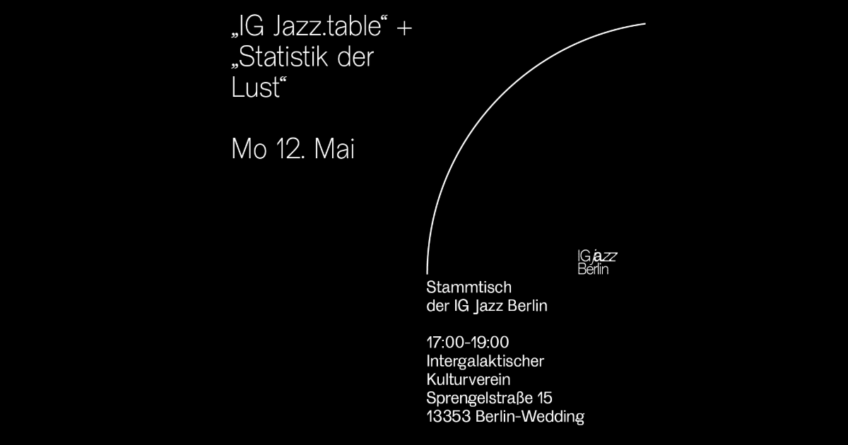 Die kommende Ausgabe der "Statistik der Lust" am Mo 12. Mai ist eine Kooperation mit dem "IG Jazz.table", dem Stammtisch der IG Jazz Berlin. Vorstellen wird sich der Gitarrist Carlos Corona, der in seiner Arbeit eigene Kompositionen und Arrangements mexikanischer Musik auf der brasilianischen siebensaitigen Gitarre erkundet. Nach dem gemeinsamen Spielen und Zuhören gibt es die Möglichkeit, Fragen zur IG Jazz Berlin zu stellen: Wozu braucht es eine Interessengemeinschaft für Jazz und Improvisierte Musik? Welche Förderungen gibt es in Berlin? Was ist die Jazzwoche Berlin und wie kann ich als Musiker*in oder Veranstalter*in mitmachen?