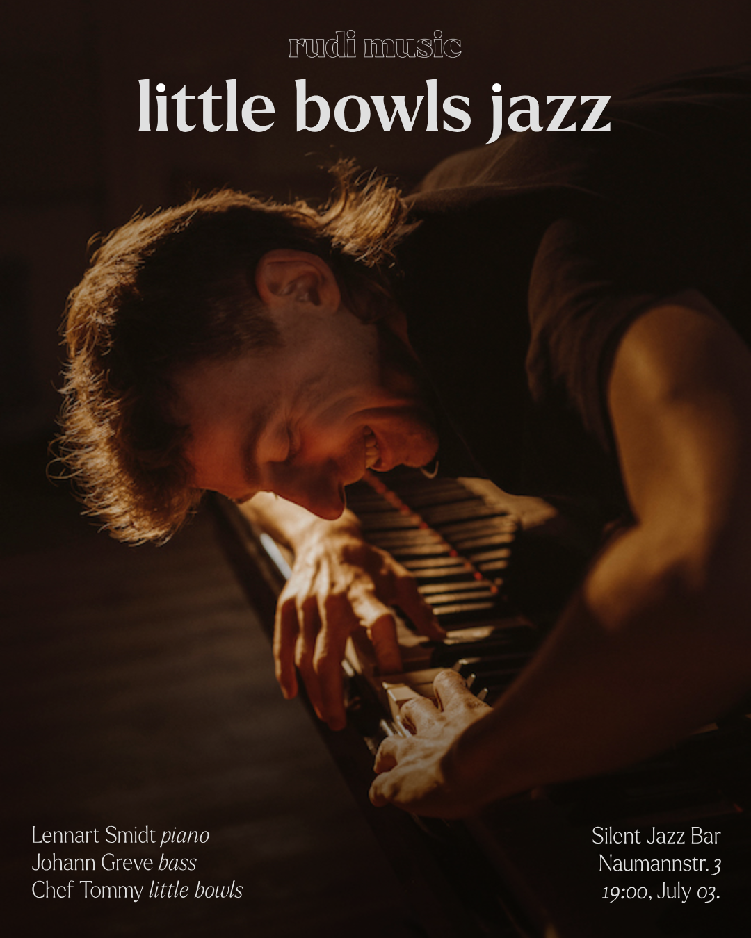 Ein intimer Abend mit improvisierter Musik und kulinarischen Genüssen. Der Pianist Lennart Smidt, begleitet vom Bassisten Johann Greve und Gastkoch Tommy, präsentieren eine gemeinsame Performance aus Klang und Geschmack: vier sorgfältig zubereitete kleine Gerichte, serviert zwischen drei Live-Jazz-Sets.